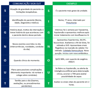 O SIGN OUT ainda é pouco utilizado em instituições brasileiras, porém, como outros mnemônicos, se bem aplicada e com equipes capacitadas, pode contribuir muito na comunicação eficaz e segura no que tange às transferências de informações, passagens de plantão, transferências de cuidados, em todos os processos que envolvem a comunicação efetiva e a continuidade do cuidado nas instituições de saúde. Este formato contempla as principais informações relacionadas à continuidade do cuidado e à transferência de informações entre os profissionais de saúde, promovendo segurança e qualidade assistencial.